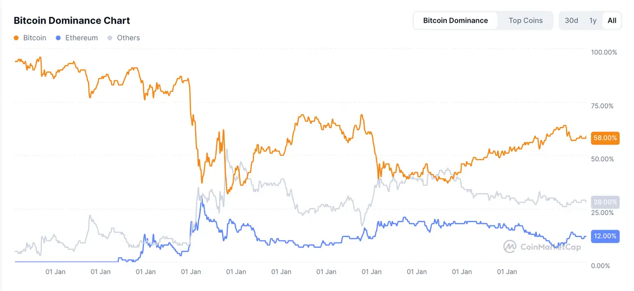 图2.BTC和ETH市占率变化(来自CoinMarketCap)