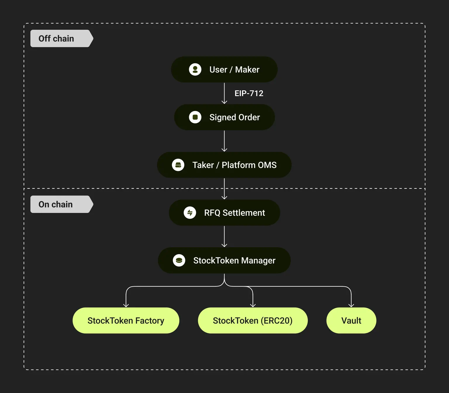 由于股票交易无法在链上直接撮合,Stove 并未采用 AMM,而是引入 RFQ(Request-for-Quote)模式,将交易过程拆分为两个阶段:用户在链下生成并签名订单,表达可验证的交易意图;具备合规资质的执行方在现实市场中完成股票买卖后,再将结果提交至链上进行结算。