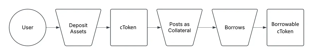 协议采用统一的 cToken 模型:用户存入资产获得生息 cToken,可作为抵押,也可为可借资产;兑换率随利息累积而增加。