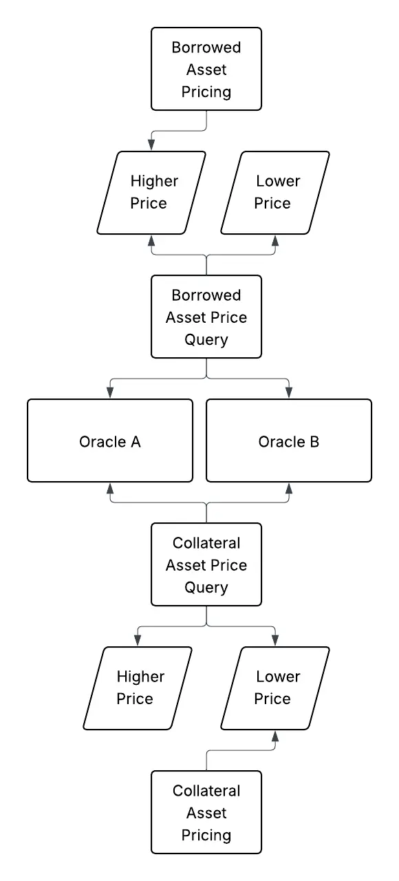 两个价格源交叉校验,借方选高价、抵押选低价,抗操纵、抗极端行情。