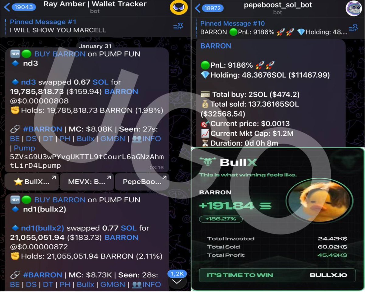 举个例子,我当时一直在密切追踪 Marcell 的钱包动向,所以每天都能看到他新充值的钱包。1 月 31 日那天,他亲自下场发行并大额持仓了 $BARRON 代币。