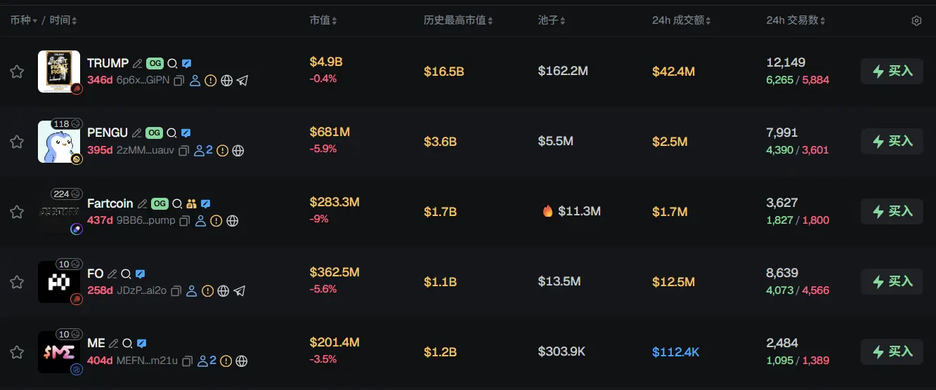 过去 24h Solana 热门代币前五依次为:TRUMP、PENGU、Fartcoin、FO、ME