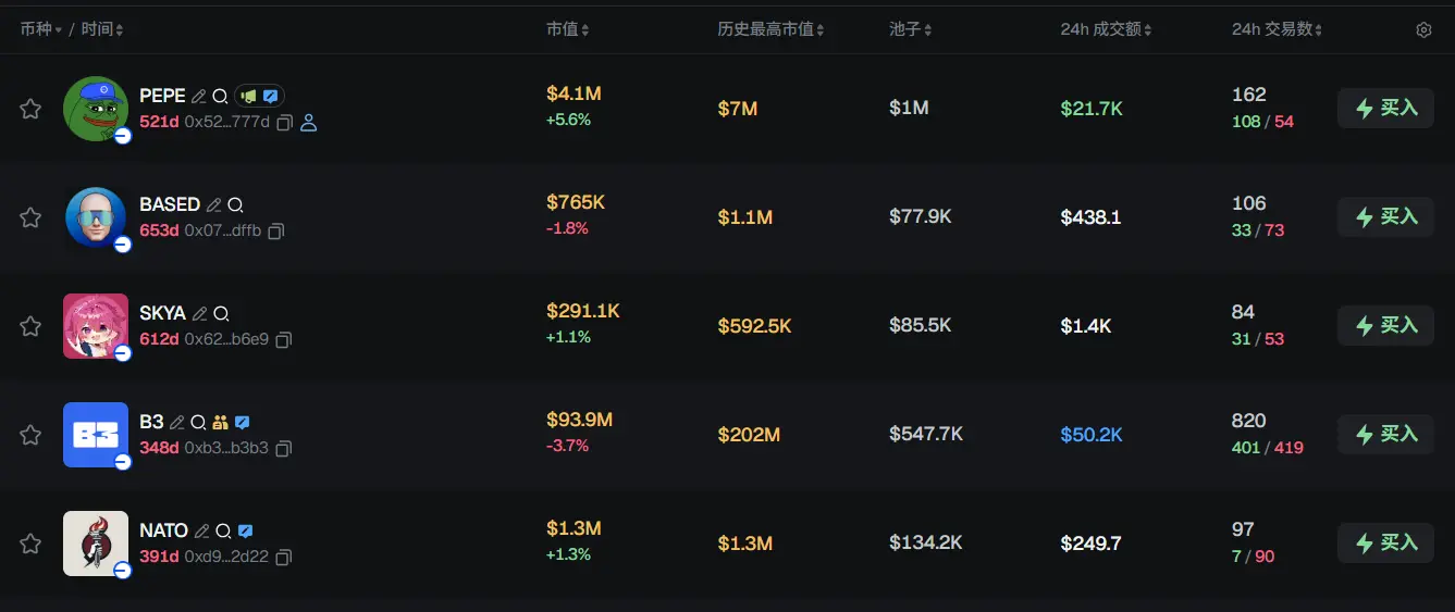 过去 24h Base 热门代币前五依次为:PEPE、BASED、SKYA、B3、NATO