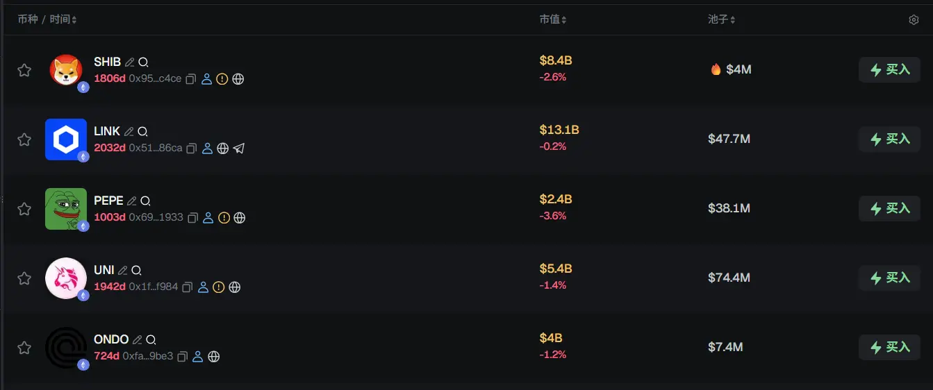 过去 24h ETH 热门代币前五依次为:SHIB、LINK、PEPE、UNI、ONDO