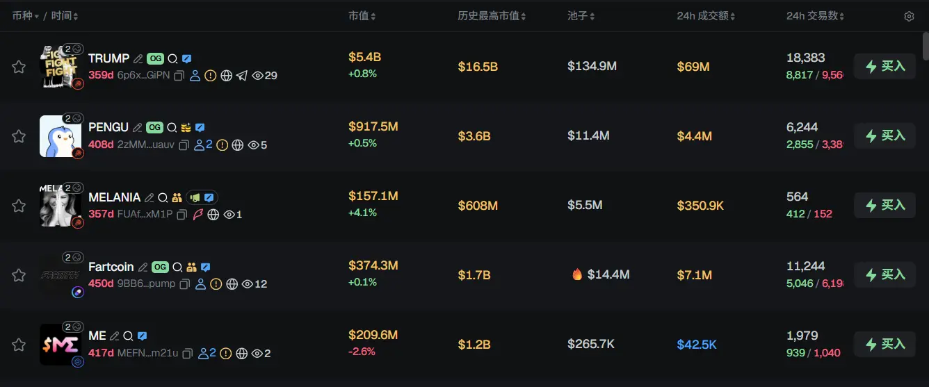 过去 24h Solana 热门代币前五依次为:TRUMP、PENGU、MELANIA、Fartcoin、ME