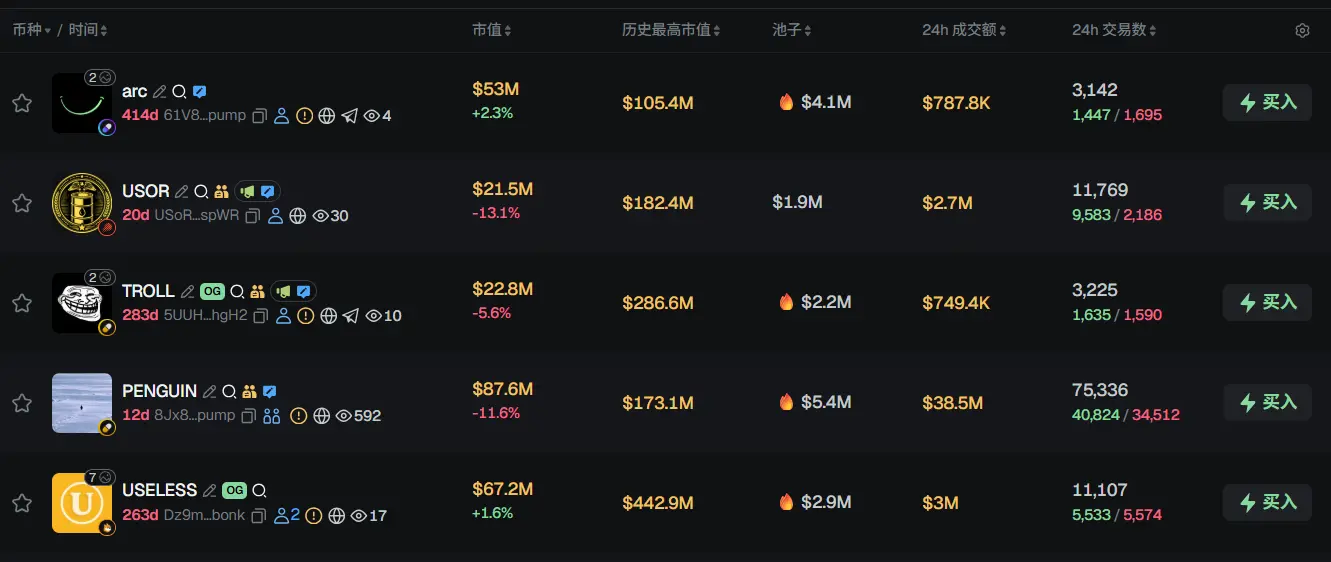 过去 24h Solana 热门代币前五依次为:arc、USOR、TROLL、PENGUIN、USELESS