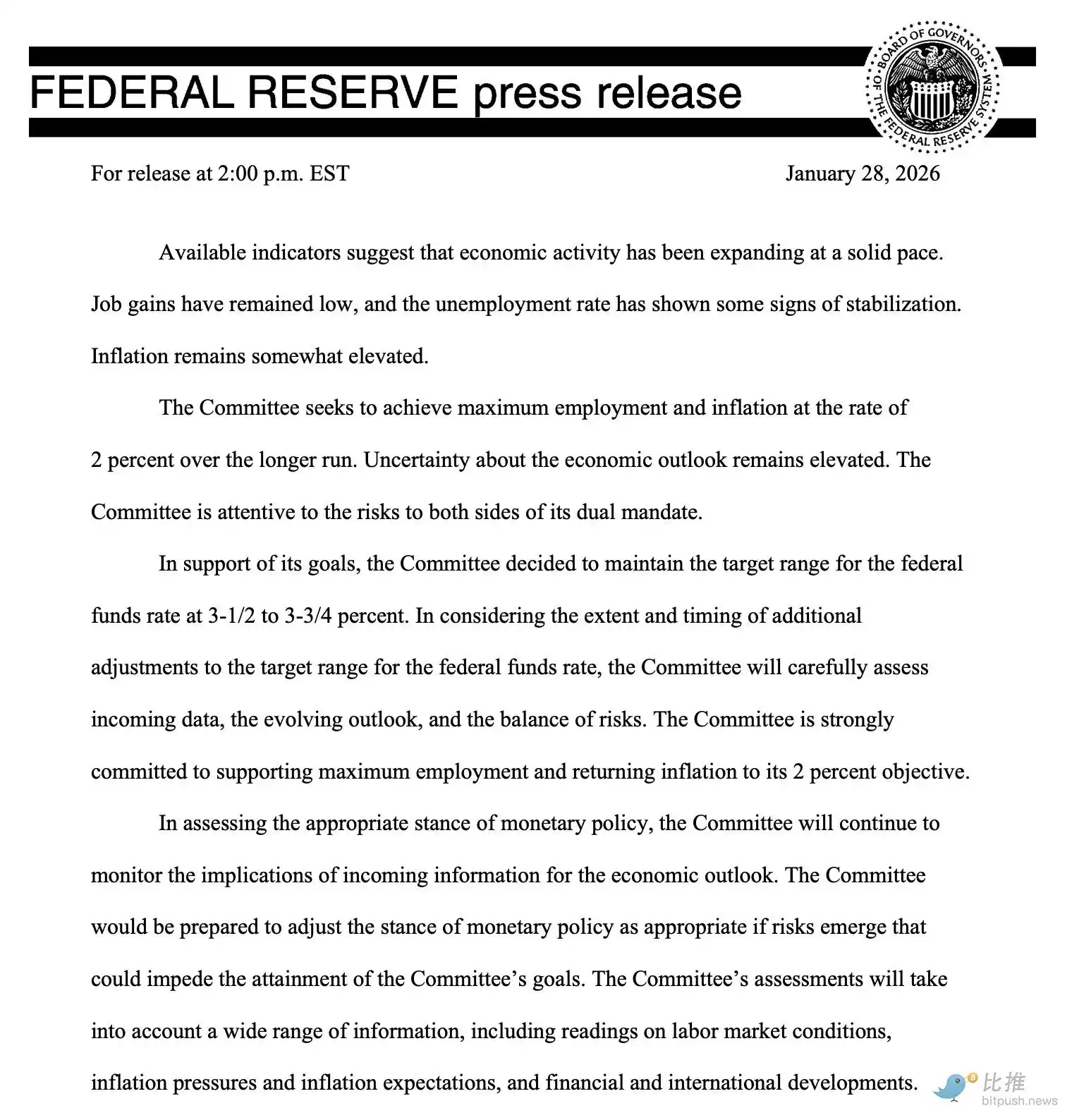 Bitget UEX 日报|美联储鹰派维稳利率;特朗普威胁伊朗金银新高后回落;存储板块强势希捷涨超19% (2026年1月29日)一、热点要闻 美联储动态 美联储维持利率不变,鲍威尔言论偏鹰派美联储将联邦基金利率区间保持在3.5%-3.75%,连续三次降息后首次按兵不动,理事米兰与沃勒投下反对票主张降息25基点。 鲍威尔指出通胀