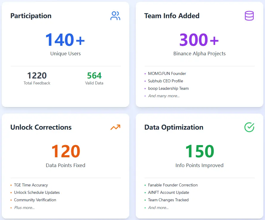 同时,我们修正了约 120 处代币解锁信息。其中有些是 TGE 时间不够准确,有些是解锁规则没有在第一时间公示,这些问题都通过社区成员的力量得到优化。