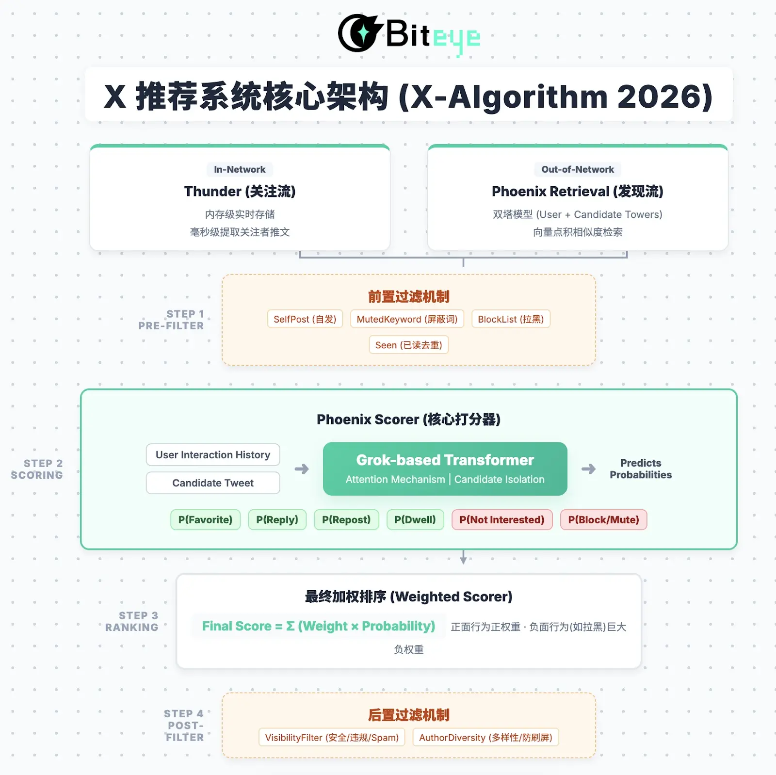 • 逻辑: 全面废除人工特征,由 Grok 大模型进行语义理解并预测用户行为