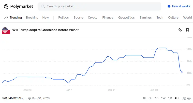 综合来看,此次围绕格陵兰与欧盟关税的风险缓和,更像是移除了一项“尾部风险”,而非为加密市场打开新的上行通道。预测市场成功提前捕捉到政治预期变化,并在短期内影响了跨资产配置,但要将概率改善转化为持续的价格上行,仍需更深层的支撑条件,包括流动性改善、ETF 资金回流以及更明确的政策与监管路径。
