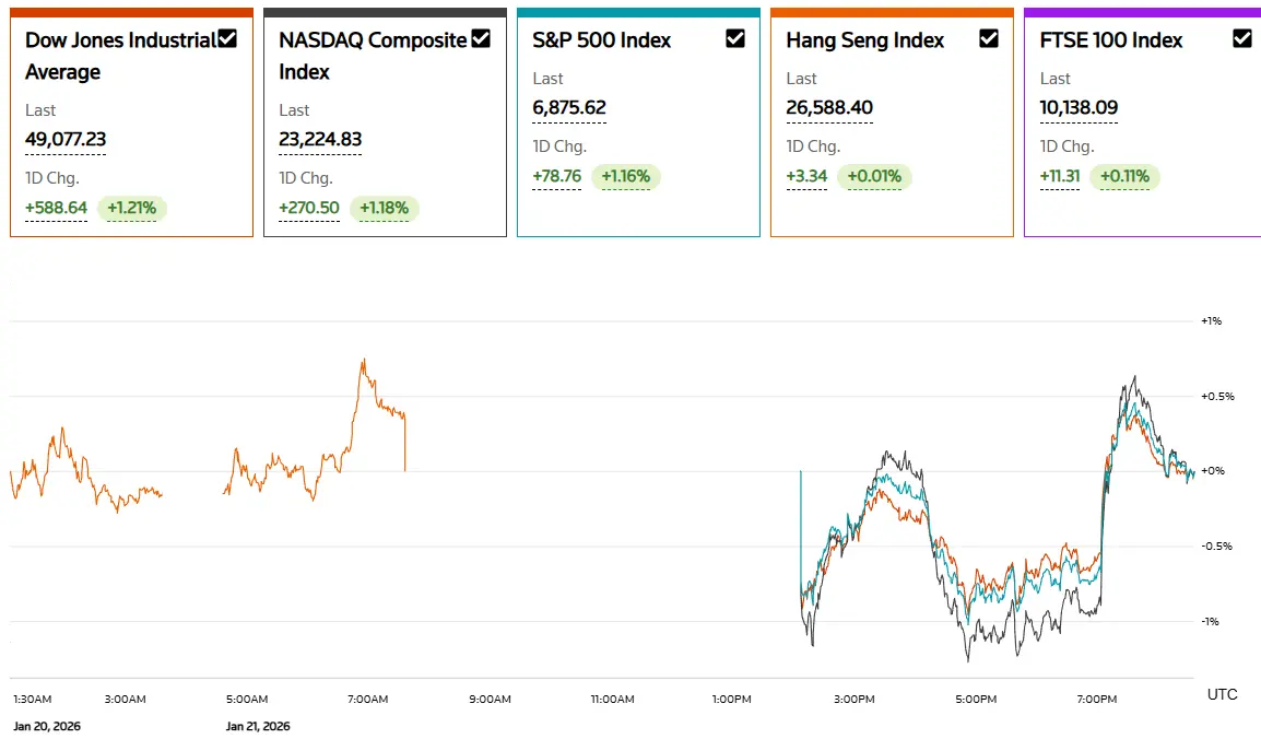 全球风险情绪在短时间内发生明显转向。美国总统特朗普确认,美国将暂缓原定于 2 月 1 日对欧盟商品加征关税的计划,此前美方已与北约就格陵兰岛及更广泛的北极安全事务达成初步协调框架。这一表态迅速消除了年初以来最突出的地缘政治不确定性之一。根据路透社与彭博社的报道,特朗普强调美国不会因格陵兰问题对欧洲采取经济或军事胁迫,而是将其置于遏制俄罗斯与中国在北极地区影响力的战略对话之中,市场普遍将这一立场解读为短期贸易与安全风险显著下降。