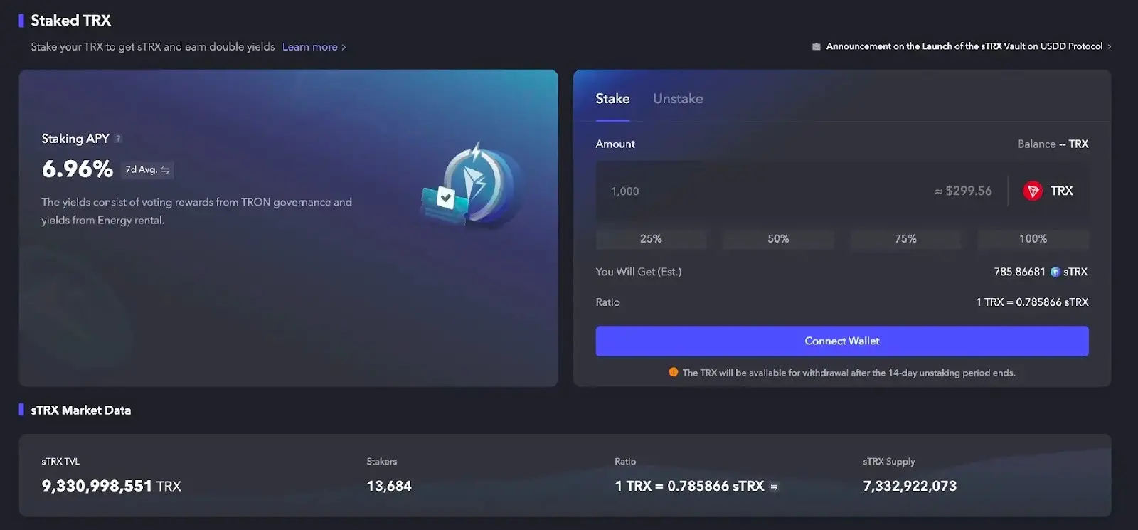 另一方面,协议通过产品创新成功拓宽了价值捕获的边界。其中,sTRX服务的设计尤为精妙,它创新性地解决了权益质押与资产流动性之间的固有矛盾。该服务允许用户将质押的TRX转化为可流通的sTRX代币,用户在持续获得TRX原生质押奖励的同时,能够将sTRX作为流动性资产,无缝参与到JustLend DAO的借贷市场或在SUN.io提供流动性等多元金融场景中。