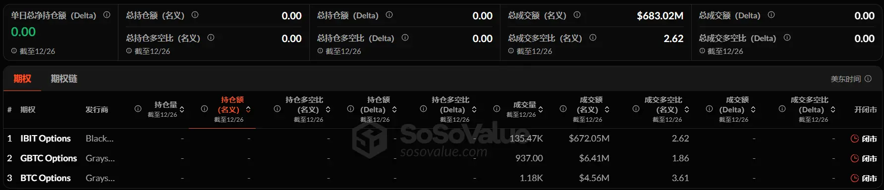 截至 12 月 26 日,美国比特币现货 ETF 期权名义总成交额为 6.83 亿美元,名义总成交多空比为 2.62。