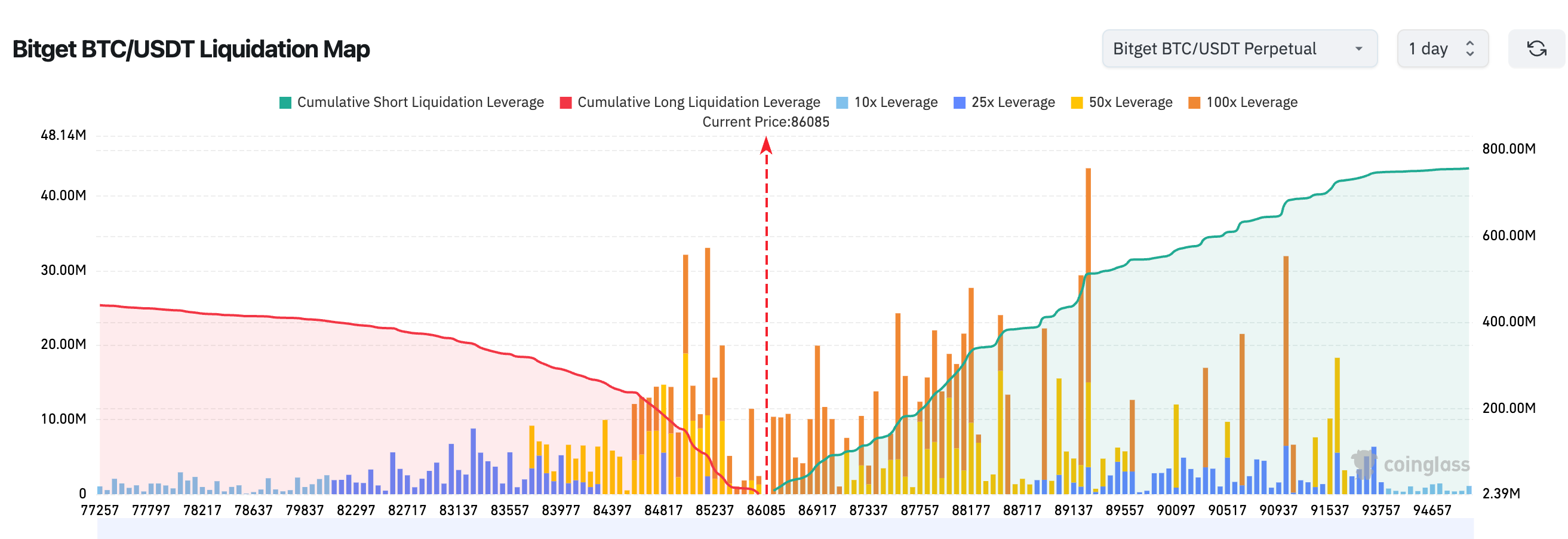3、Bitget BTC/USDT清算地图显示:当前价位约 86,085 美元下方多头清算密集,若跌破 85k 一线,可能触发连环止损并放大下行波动。上方 88k–92k 区间空头清算持续累积,一旦有效突破,容易引发空头挤压,推动价格快速上行。