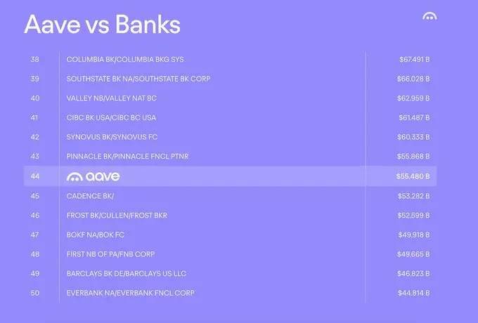 更重要的是,从体量上看,Aave 协议如今已经可以与美国排名前 50 的银行相提并论——而美国正是全球金融体系的核心枢纽。