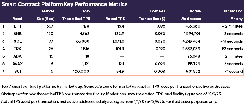 新一代区块链正在不断推动技术的前沿发展。然而,一些投资者认为,并不需要更多的区块空间,因为现有区块链的需求尚未饱和。Solana 曾是这种批评的典型例子:一个速度快但使用率低的区块链,曾被认为是“过剩区块空间”的代表,但在一波采用浪潮后,它成为了行业内最成功的案例之一。尽管并非所有当今的高性能区块链都会走上类似的道路,但我们预计会有少数几个脱颖而出。卓越的技术并不能保证被广泛采用,但这些下一代网络的架构使其在新兴领域中具有独特优势,例如 AI 微支付、实时游戏循环、高频链上交易和基于意图的系统。在这一领域,我们预计 Sui 将凭借其技术优势和集成开发策略脱颖而出(见图15)。其他有潜力的项目包括 Monad(并行化的 EVM)、MegaETH(超高速的以太坊二层网络)和 Near(专注于 AI 的区块链,因其 Intents 产品取得成功)。