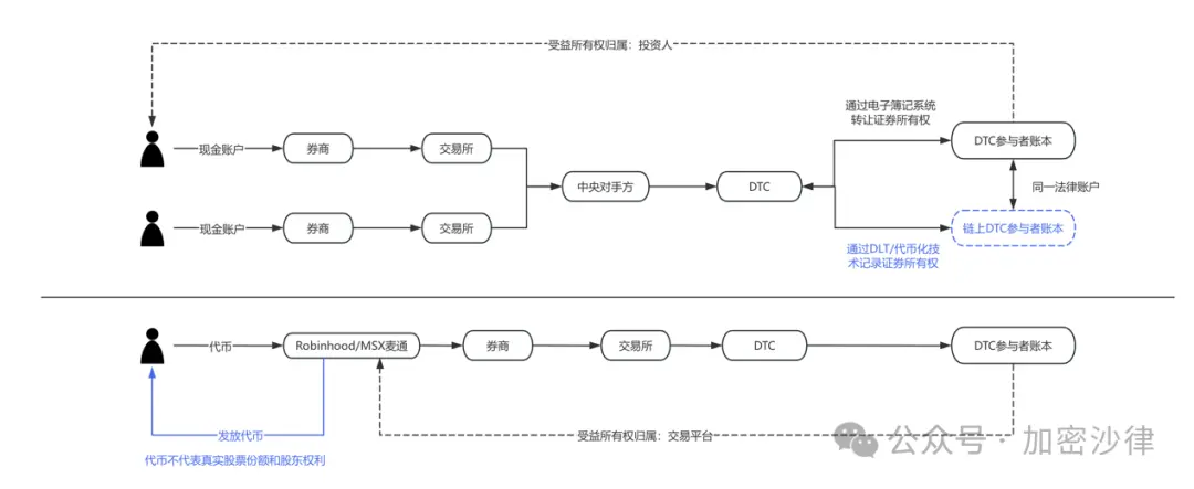 为了让这件事更加通俗易懂,我们画了一张流程图,蓝色部分就是纳斯达克在今年 9 月的提案中申请改变的部分。可以明显看出,DTC 是美股代币化的关键实现和实操机构。