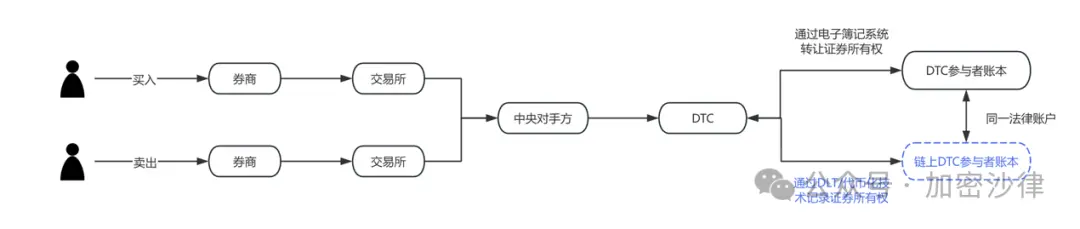 目前,美股的托管记账采用这样的运行模式:假设券商在 DTC 有账户,DTC 会用一套中心化系统记录买入、卖出的每一笔股票和份额。而这次 DTC 提出,我们能不能给券商提供一个选择,把这些股票持仓记录用区块链代币的方式再记录一遍?