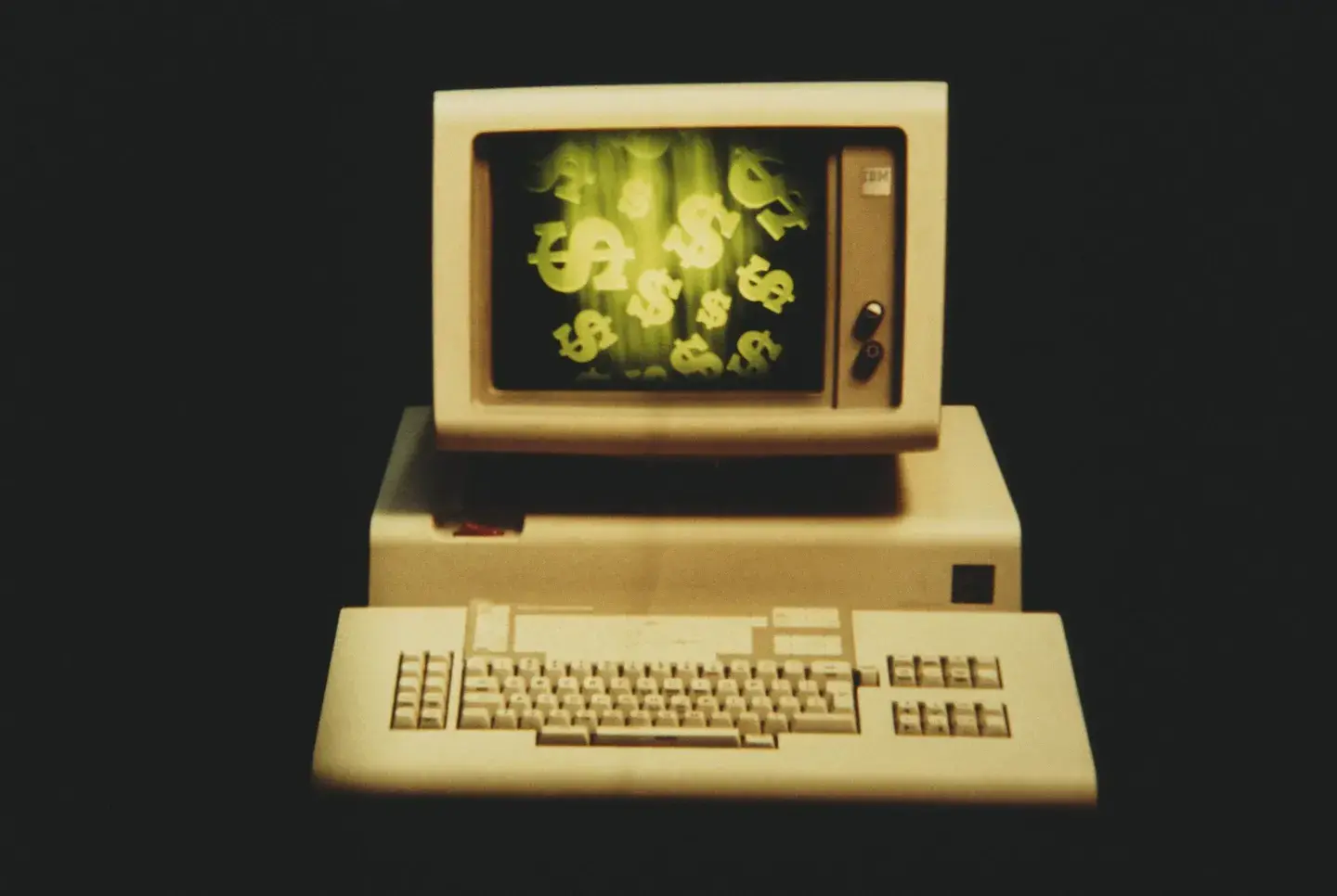 1983 年,一台 IBM 电脑显示器上闪现的美元符号。