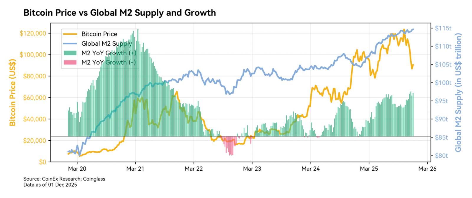 自 2024 年 ETF 推出后,比特币与 M2 的相关性已明显减弱。