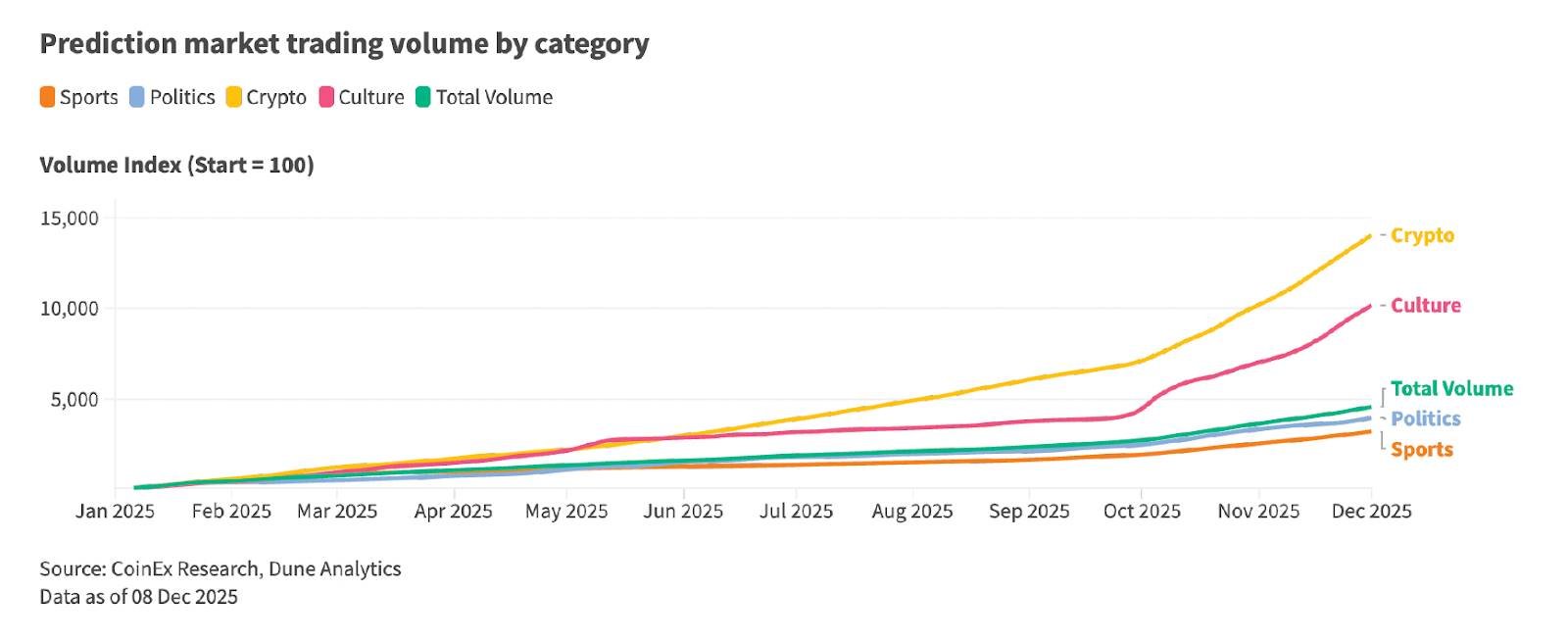 2025 年周交易量突破 30 亿美元。2026 年将出现预测市场与传统衍生品结合的混合产品。