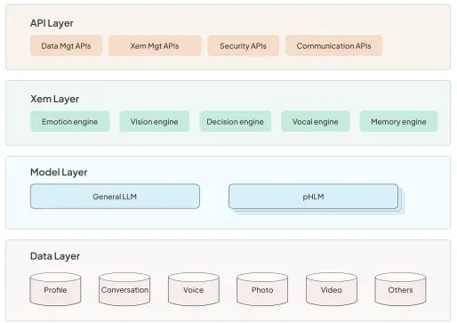 API 层作为对外接口,向第三方应用开放智能体管理、数据调用与安全校验能力。通过这一层,Xem 可以脱离单一应用运行,并在不同场景中保持状态连续性。