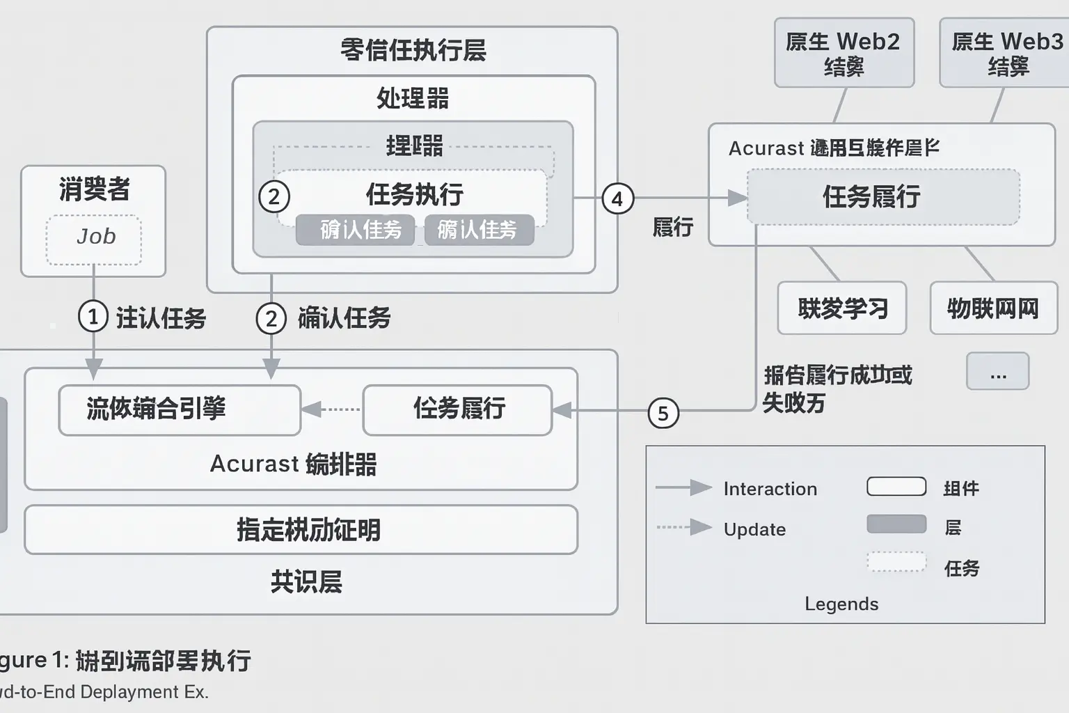 Acurast 的端到端部署执行(End-to-End Deployment Execution)展示了一个部署从定义、匹配、执行到最终完成的整个生命周期。流程包含 5 个关键步骤: