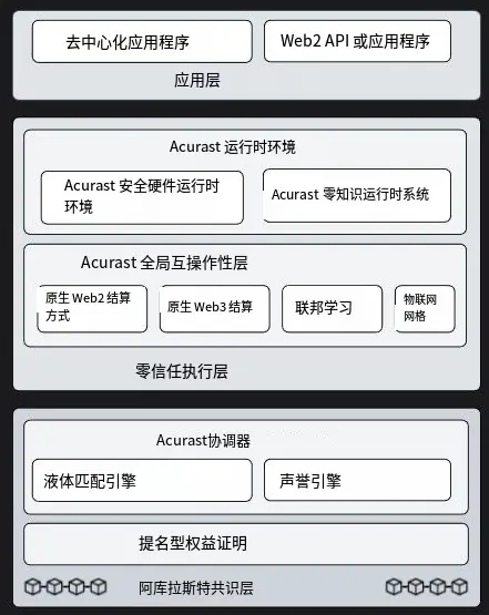 Acurast 的执行层采用模块化设计,允许根据用例和部署的需求灵活选择运行时。将执行层与共识层、应用层解耦,使得运行时能够长期独立演进,避免了依赖锁定。此外,它还确保了最高级别的服务和机密性,因为安全模型可以随着新威胁的出现或新需求的产生而通过升级进行迭代演进。