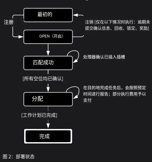 1. 部署注册:开发者定义执行目标、调度策略、资源需求、奖励机制,并选择处理器类型(私有、可信或公共)。部署登记后进入 OPEN 状态。