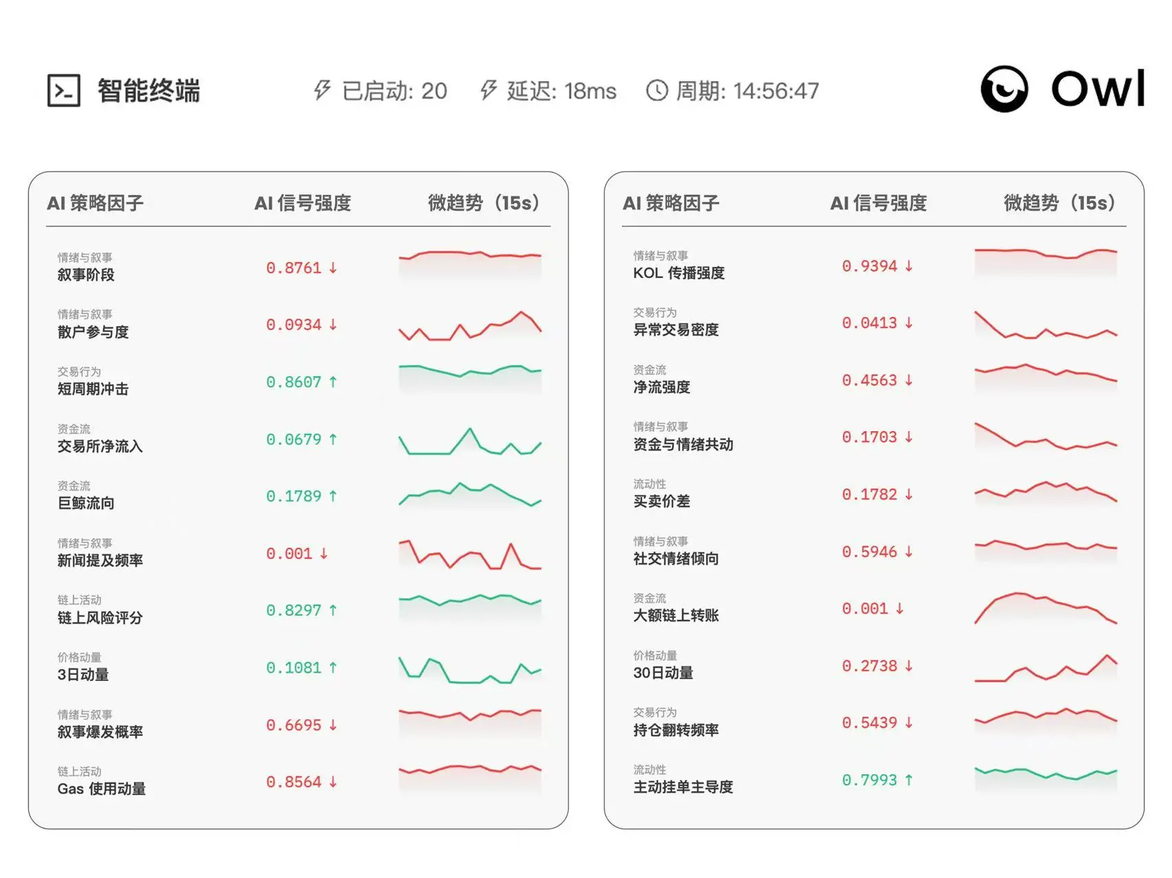 Owl AI智能体依托机构级量化策略运行,实时监测超50项核心市场指标,覆盖市场多个关键维度: