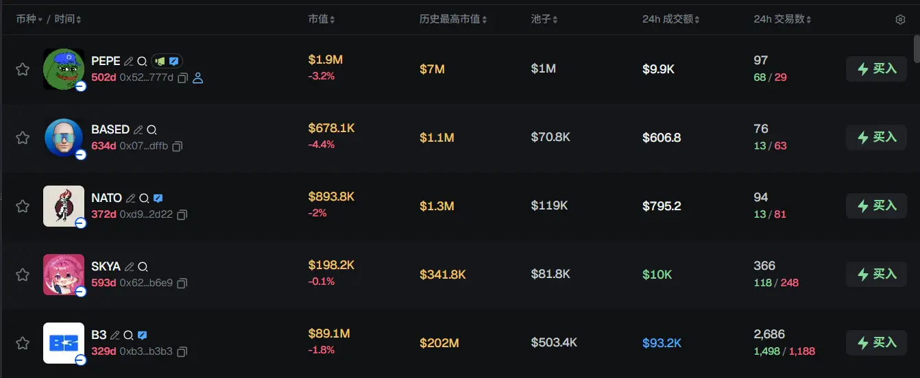 过去 24h Base 热门代币前五依次为:PEPE、BASED、NATO、SKYA、B3