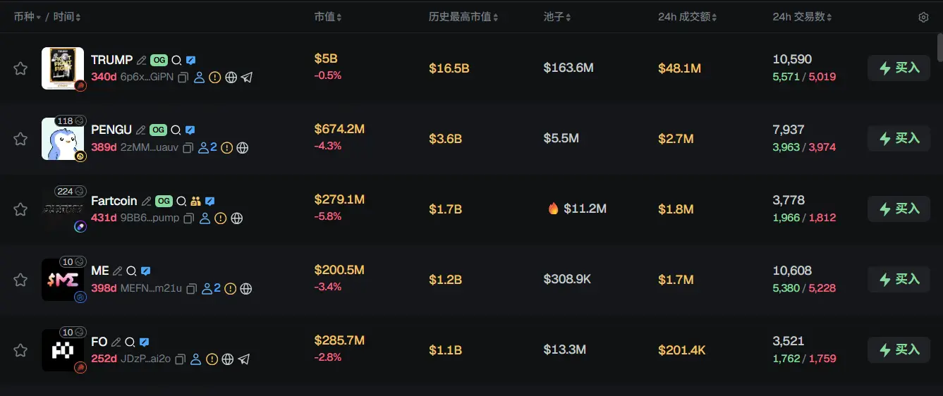 过去 24h Solana 热门代币前五依次为:TRUMP、PENGU、Fartcoin、ME、FO