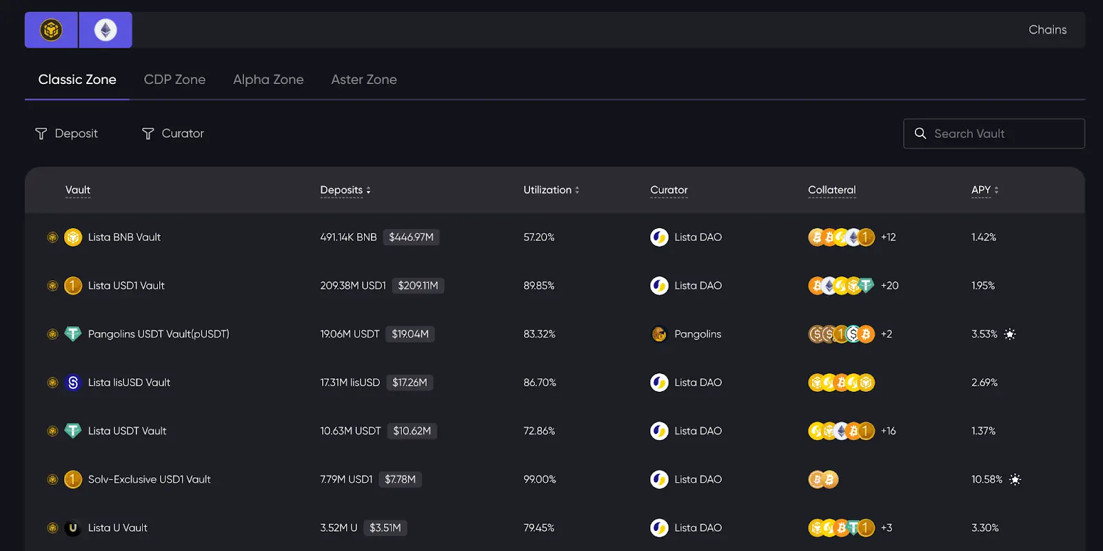 即便机构大量入场,BNB Chain 上的散户热度丝毫未减。2025 年,多轮 meme 币行情在 Four.meme 等平台集中爆发,推高了 BNB 的链上交易量,并一度带动 BNB 价格创出历史新高近 1300 美元。此外,PerpDex 平台 Aster 也提供高杠杆工具,并且低 gas、高 TPS 的环境让这类用户可以轻松实现日内多次操作。在交易频次之外,散户也通过参与链上金库等策略,获取被动收益,比如 ListaDAO 已上线包含 BNB、USD1、USDT 在内的十余个金库。
