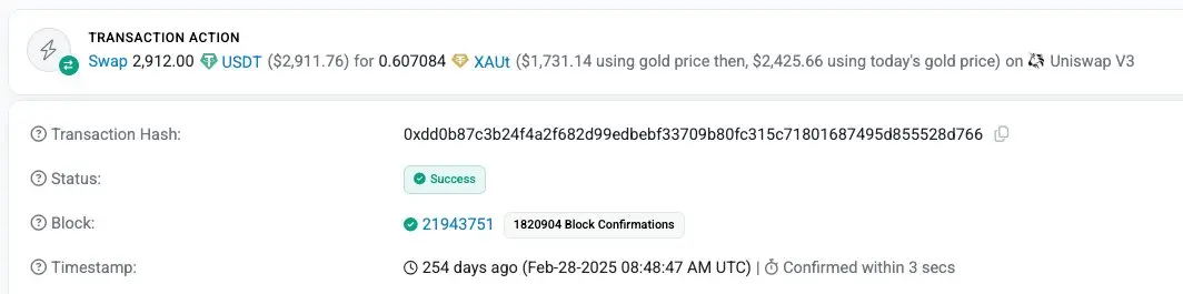 看看这笔 2025 年 2 月发生的 XAUT 交易。一名用户花费 2,912 USDT 仅获得了价值 1,731 美元的 XAUT(按当时的真实金价计算),溢价支付了 68%。