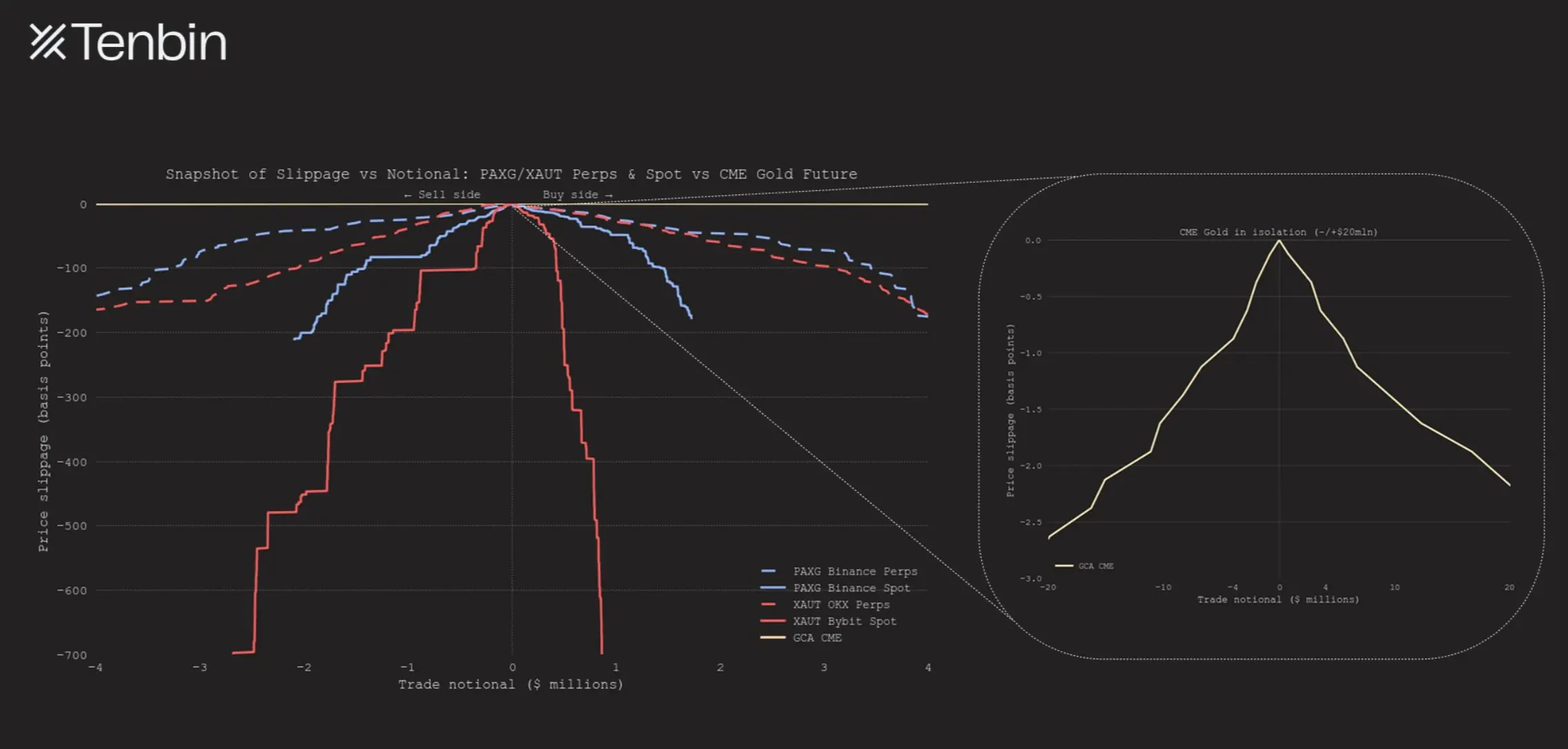 (图表说明:PAXG/XAUT 永续与现货 vs CME 黄金期货(实物交割合约)的滑点与交易规模对比)