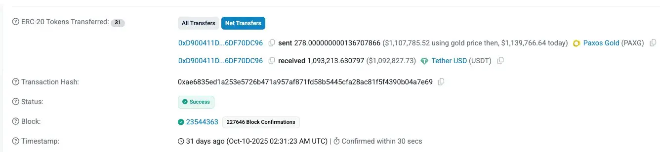 另一笔交易显示,一名用户卖出价值 110.7 万美元的 PAXG(按当时金价计算),仅收到 109.3 万 USDT,滑点约为 1.3%。虽然没有那么极端,但在传统市场通常以个位数基点而非百分比来衡量价格冲击的背景下,这种滑点水平依然高得令人无法接受。