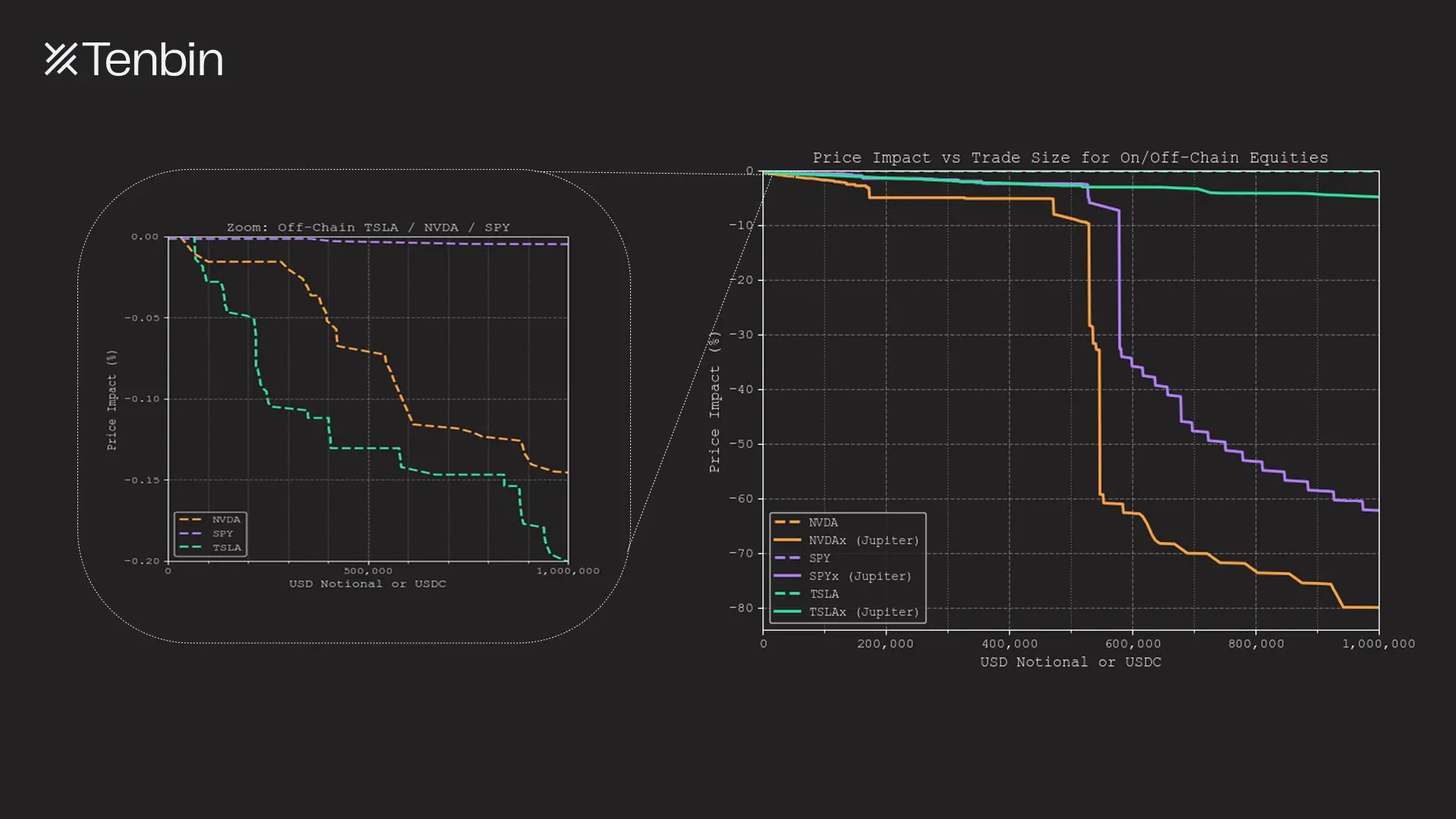 TSLAx 和 NVDAx 是目前前十大单一名称代币化股票中的两只。在 Jupiter 上,一笔 100 万美元兑换 TSLAx 的交易会产生约 5% 的滑点。而 NVDAx 则面临难以逾越的 80% 滑点。相比之下,在传统市场上进行 100 万美元的特斯拉或英伟达交易,分别只会产生 18 个基点和 14 个基点的价格影响(这还没算上暗池等场外交易场所的流动性)。