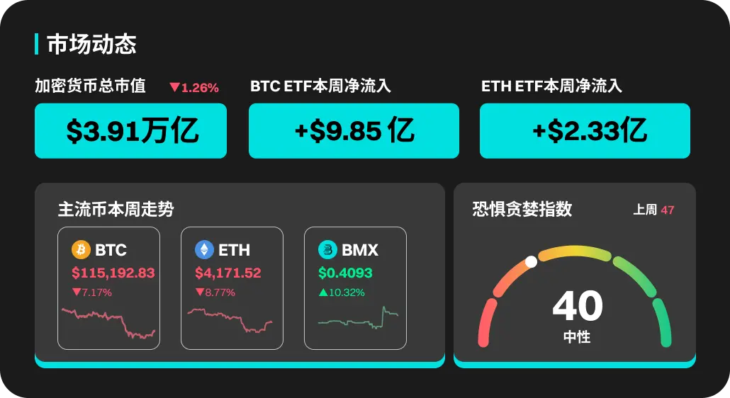 本周加密市场动态比特币价格飙升至历史新高,接近12.6万美元,这得益于美国现货ETF创纪录的流入——上周流入32亿美元,本周流入27亿美元,推动两周流入量超过59亿美元。ETF需求的强劲复苏重振了市场