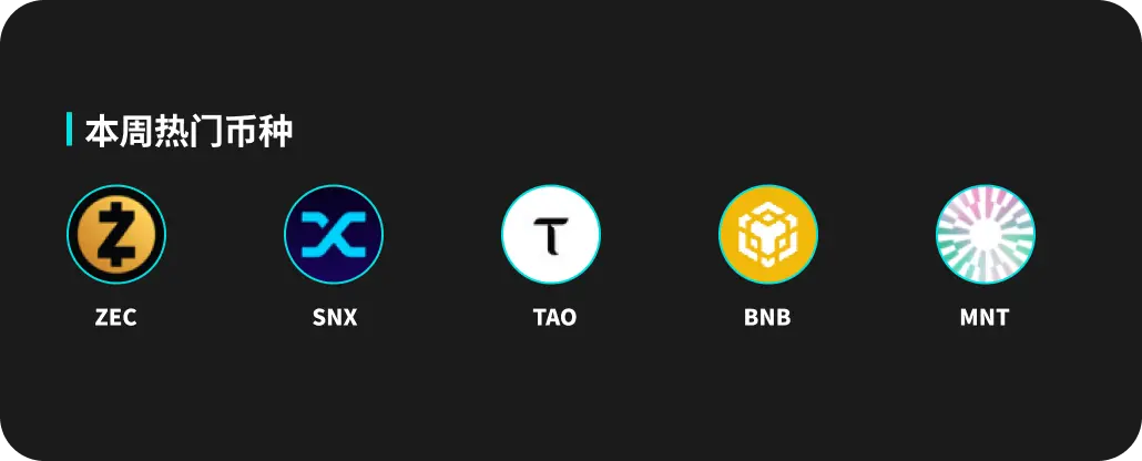 热门币种方面,ZEC、SNX、TAO、BNB 和 MNT 都有着不俗的表现。ZEC本周价格上涨71.8%,24小时交易量88M。SNX价格上涨65%,最高价格为294.75 USDT。TAO和BNB本周分别上涨31.2%和10.8%。