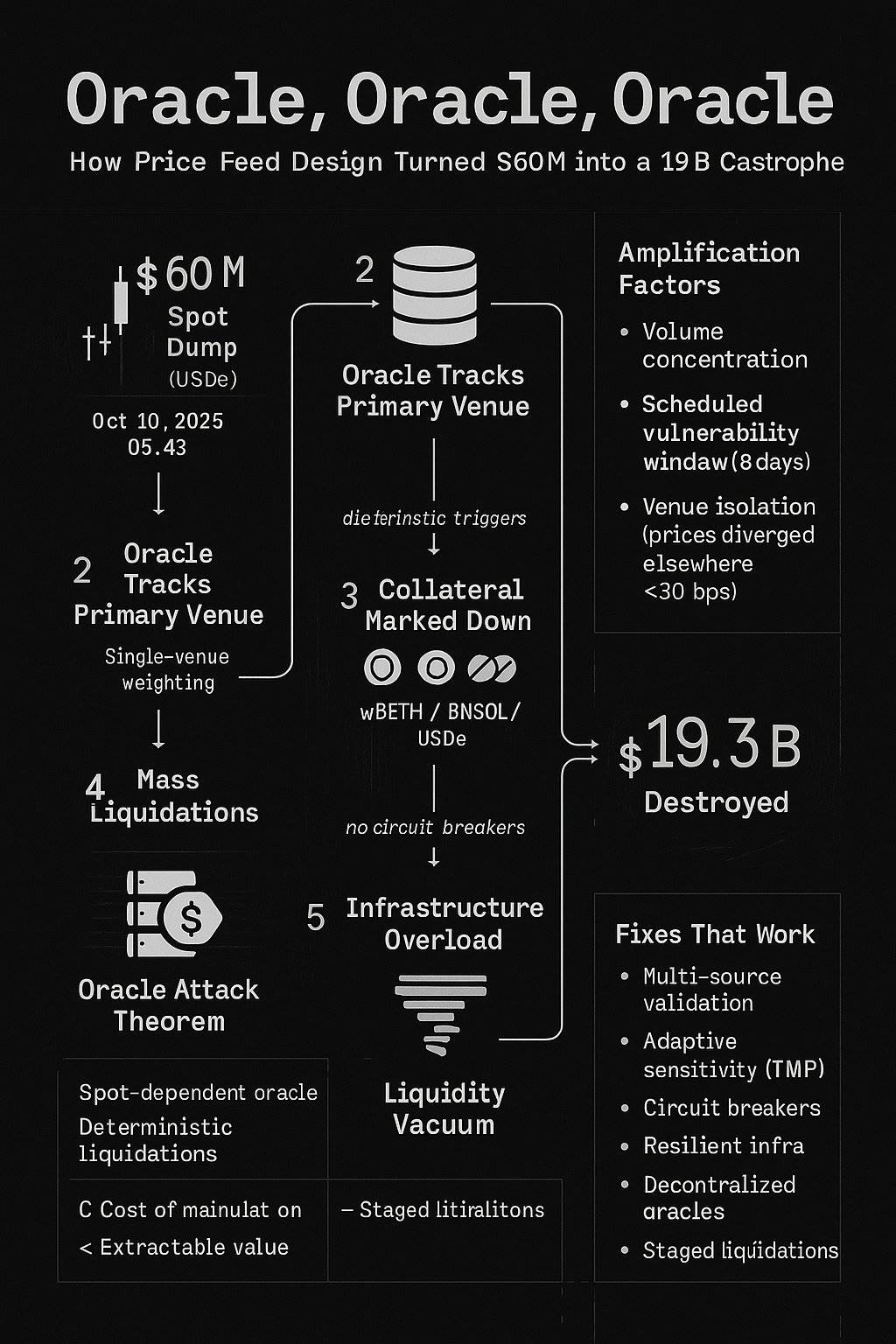 2025年10月10日至11日的清算连锁反应并非由过度杠杆或市场恐慌引发,而是大规模的预言机设计失败。6000万美元的市场行为被放大至193亿美元的破坏,这是因为价格数据系统无法区分操纵与真实价格发现。
