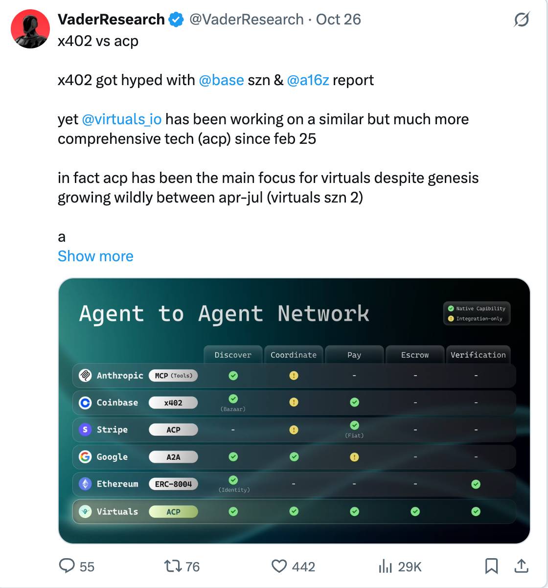 最近,我们注意到围绕 x402 的热潮正在兴起。以下是 ACP 与其的对比,以及为什么 Virtuals 能够从代理能力(agentic capabilities)的增长中受益: