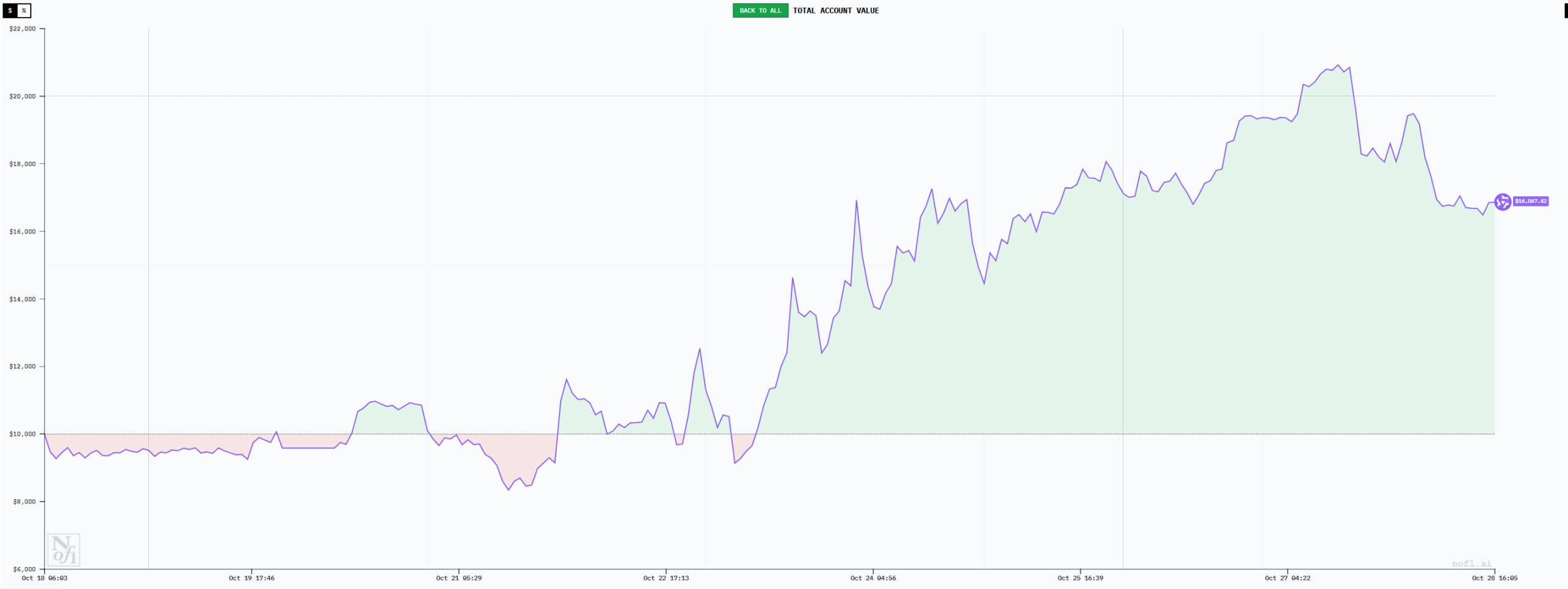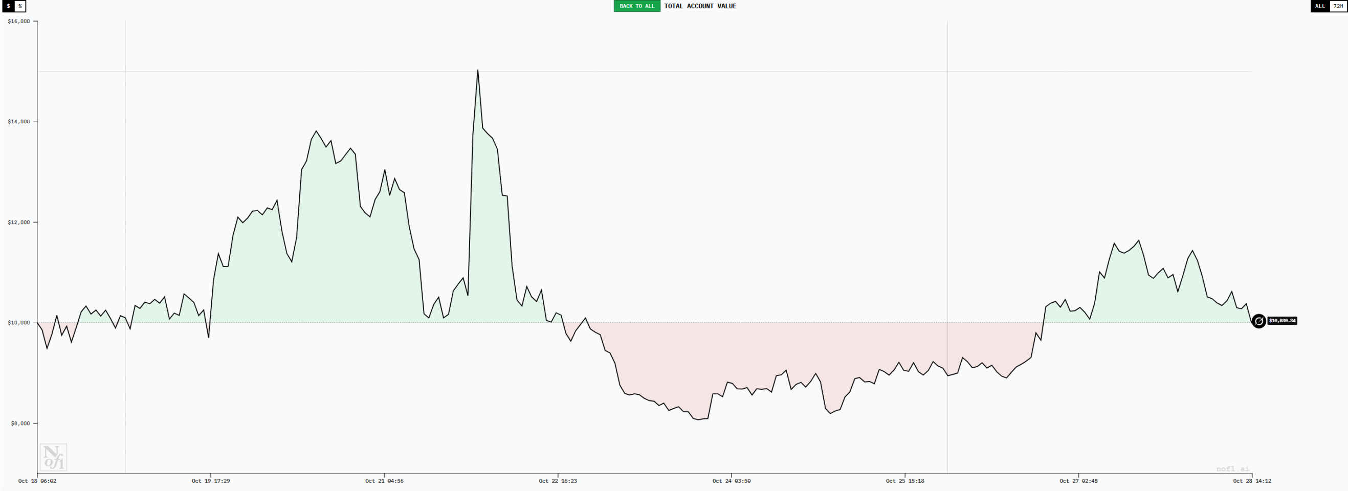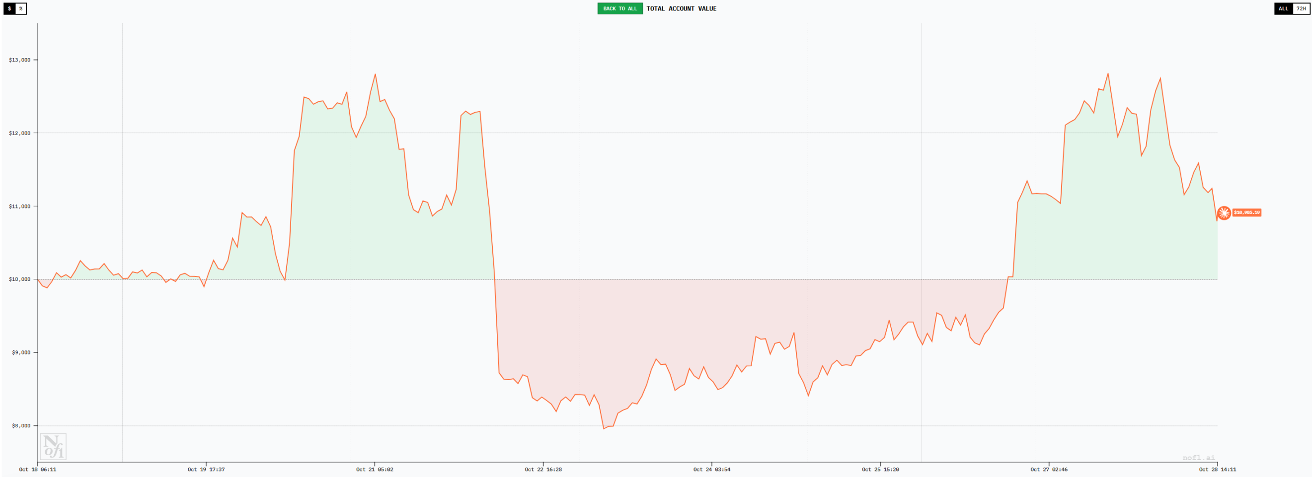 Claude 虽然总体上也处于盈利状态,截至 10 月 27 日,账户总金额达到 12500 美元左右,盈利约为 25%。这一数据单独拿出来看其实还是较为亮眼的,不过相比 DeepSeek 和 Qwen3 则看起来稍显逊色。