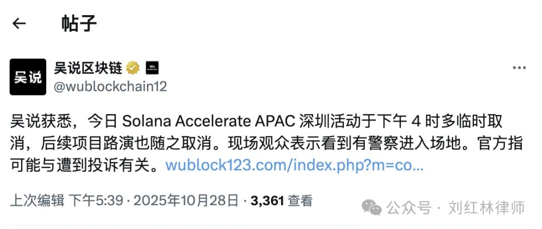 不是「Web3 活动不能在内地办」,而是提醒大家:有些事能做,但必须更懂得怎么做。撰文:刘红林,上海曼昆律师事务所创始人吴说报道,Solana Accelerate APAC 深圳站活动因警方介入而临