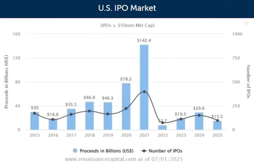 IPO 市场萎缩,被公众投资者无法参与的后期私人融资轮次(F 轮、G 轮等)所取代。