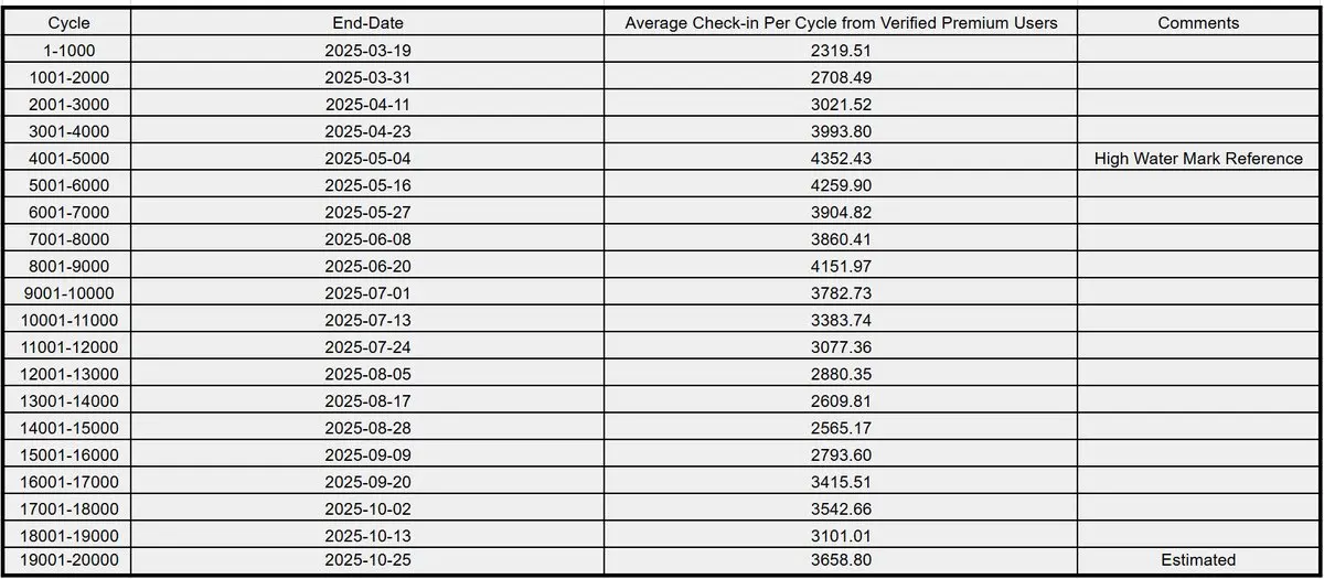 (△ 在 20 个历史周期中,平均每个周期高级认证用户的打卡数据,虚假数据已剔除。来源:X)