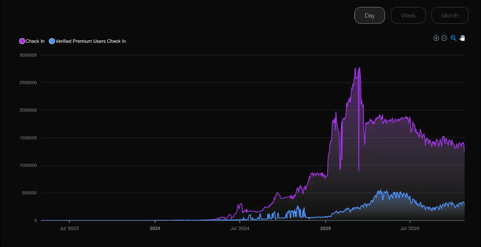 Check-In 数量 —— 直接反映活跃节点、用户参与度与网络活力。