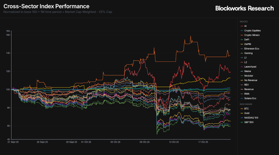 虽然短期显示一些上涨,但月线图显示几乎所有的加密货币指数在过去 30 天内都在下跌。10 月 10 日的清算事件导致了普遍的疲软,只有黄金、加密货币矿工、AI 和股票指数是表现强劲的领域。