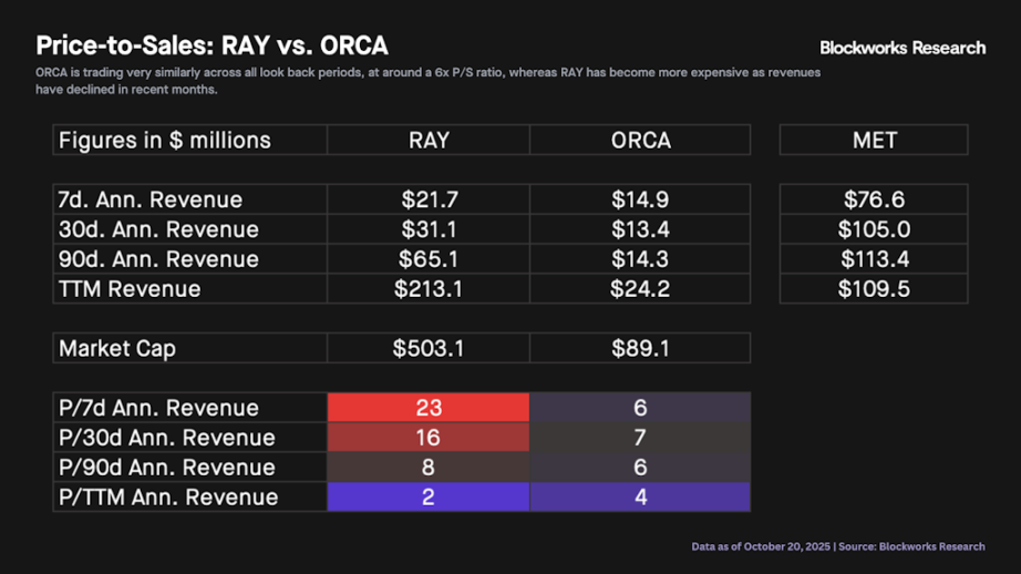 下表比较了 RAY 和 ORCA 在不同回顾期内的市销率。我们观察到 ORCA 在所有年化时间框架内的交易情况非常相似,市销率约为 6 倍。相比之下,随着收入下降,RAY 在最近几个月变得更为昂贵。就 Meteora 而言,我们看到其年化收入在约 7500 万至约 1.15 亿美元之间,具体取决于回顾期。