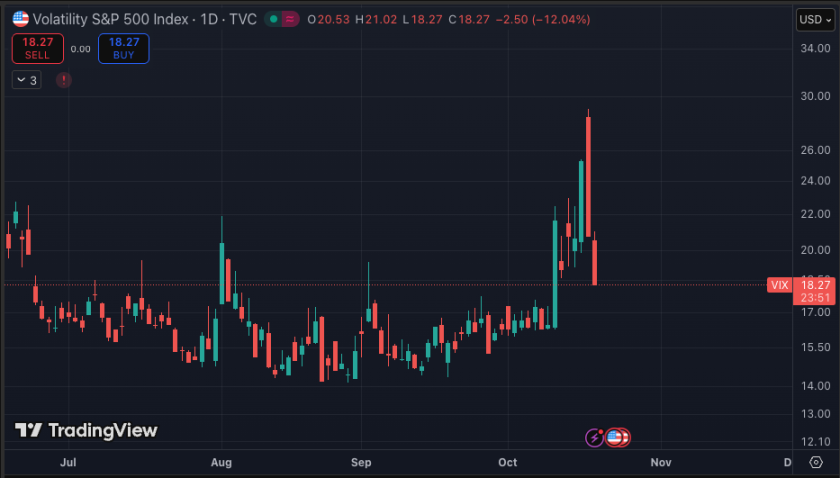 VIX 指数已显著回落,在周五早上飙升至 29 后,现已降至 18。标普 500 指数和纳斯达克指数在周一的交易时段中均走高,收盘价距离历史新高仅一步之遥。