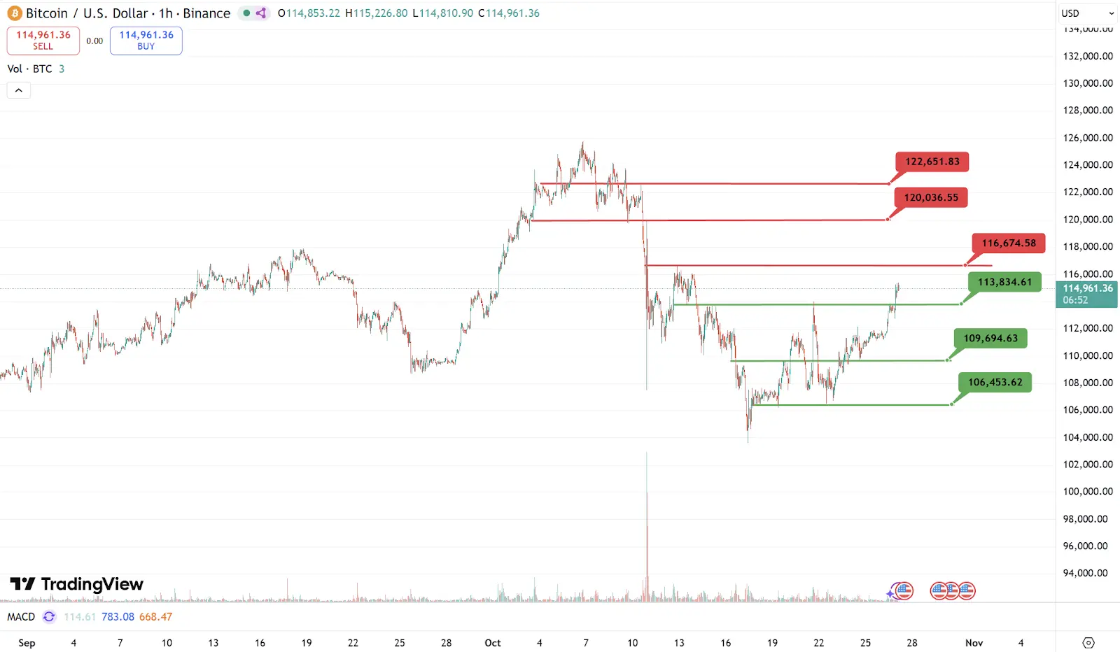 本周重点阻力:116670美元,120000美元,122650美元